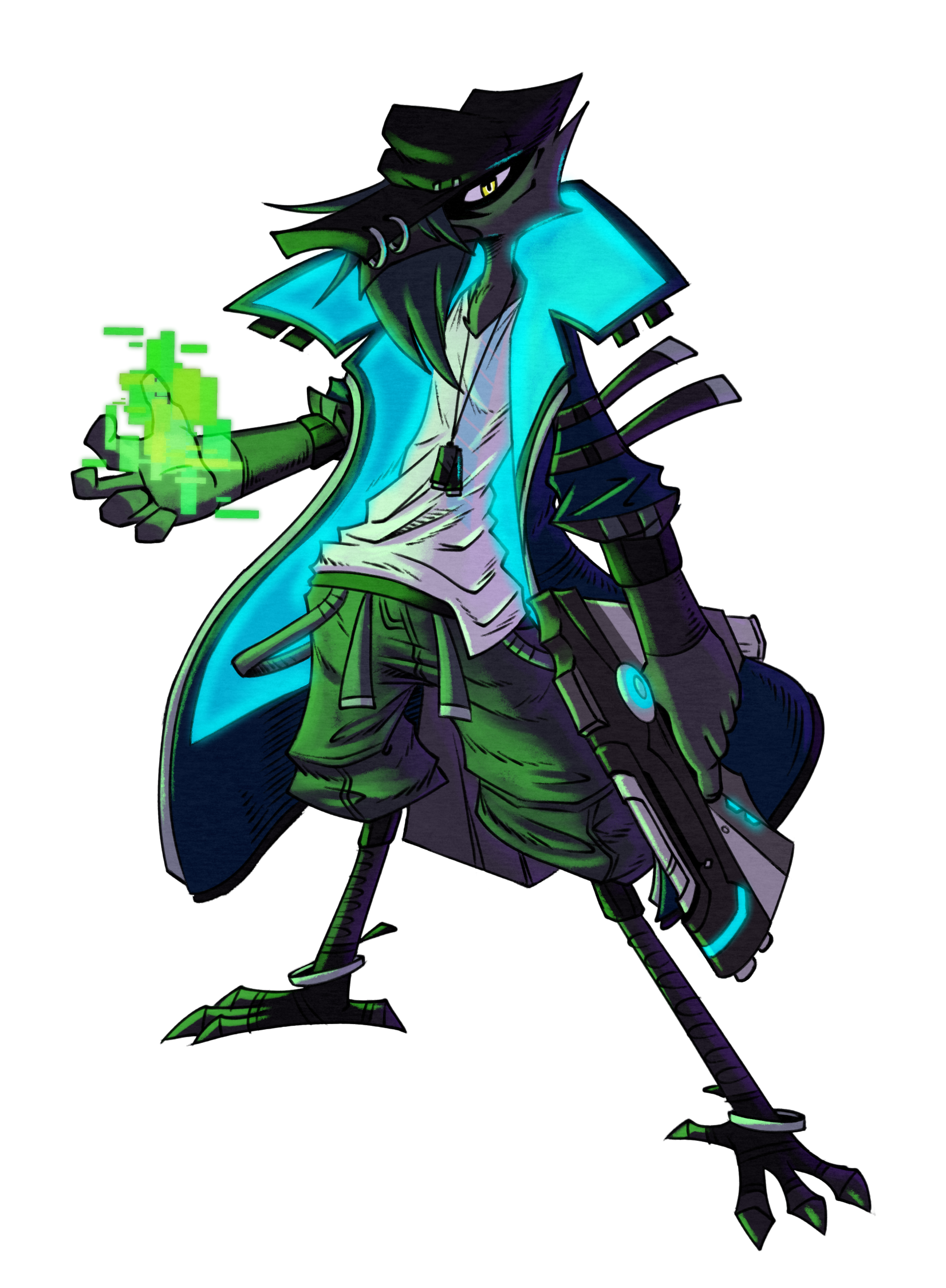 In a technological world, the weakness of flesh is unfortunately made apparent, so cybernetic augmentation has become rather commonplace in Cadet's world. After all, magic isn't real where he comes from, and you cant just create holograms without some sort of tech. Cadet has multiple mechanical inlays underneath his feathers/skin/flesh to create holograms, his left eye is fake, allowing him to have his digital readouts, and his legs have an enhanced exoskeleton to allow him to move faster without straining his muscles. He also has a USB port on the back right of his neck to allow him to interface with anything directly (though he knows that's risky since its directly going into his brain).